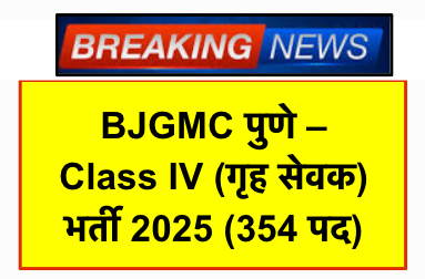 BJGMC Pune Class IV Recruitment 2025 – 354 Group D Posts BJGMC (B. J. Government Medical College & Sassoon General Hospital), पुणे में 2025 में 354 Class-IV (Group D) पदों पर भर्ती का अवसर है। यह भर्ती 15 अगस्त से 31 अगस्त 2025 तक ऑनलाइन प्रक्रिया द्वारा आयोजित की जा रही है  । शैक्षिक योग्यता 10वीं पास होना चाहिए। भूमिका अनुसार पदों में – गार्डेनर, नर्स सहायिका (Aya), क्लास IV …